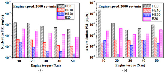 The mass concentration of PM has been computed by taking a limiting hypothesis that the particles are spherical and have a density of 1000 kg/m3. However, density and particle fractal size are subject to engine operating conditions and particle diameters [74]; therefore, these values are nominal for comparison. However, Figure 7 shows the changes of the concentration of the mass particles with engine load for HE0, HE10, HE20, and E20. The outcomes of this investigation display that there is an important reduction in the concentration of mass particulates for the blended fuels. The PM mass concentrations are decreased by 48.87%, 83.09%, and 32.89% on average for HE10, HE20, and E20, respectively. The identical explanations which lead to a decrease of total PN for the blended fuels will also lead to a decrease in the total PM mass. The reduced amount of gasoline fuel burned inside cylinder helps to decrease the mass of carbon. Furthermore, ethanol has short C–C chemical bonds and has no sulfur; thereby, there is a decrease in PM formation. It can also be noticed that the larger reduction in the mass of the particles was found at higher hydrous ethanol blends. In general, it is observed from Figure 8 that the concentration of nucleation mode particulates reduces with engine operating load. In addition, the concentrations of nucleation and accumulation mode particles are lower for the HE20 blends at all engine loads.