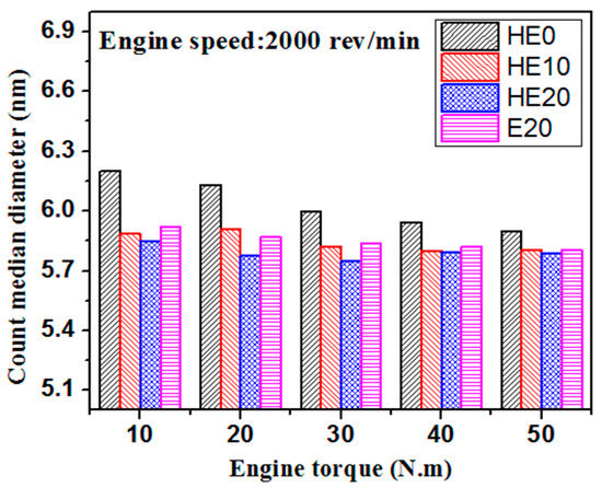 Figure 9 shows the count median diameter (CMD) of the distributions of the tested fuels versus engine loads. For the computation of the CMD, all of the particulate sizes ranging from 5 nm to 1000 nm were calculated. In Figure 9, the CMD reduces with engine operating load. In addition, the HE20 emissions ensued in a smaller particles size equated to the HE0 case: the CMD ranged from 5.7 nm to 6.2 nm. The CMD distributions are reduced by 3.11%, 4.0%, and 3.02% on average HE10, HE20, and E20, respectively.