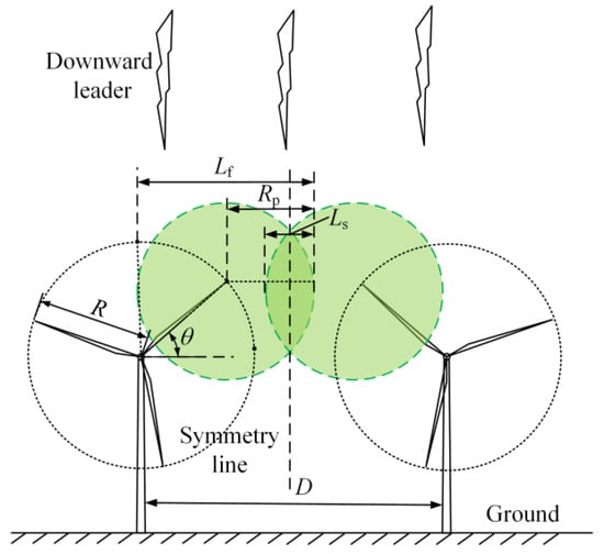 From Equations (2) and (3), N < N0, which means the intersection of the striking distance circles of two turbines enables them to shield each other, reducing the overall likelihood of lightning strikes. This improves the lightning protection of the whole wind farm. Mutual shielding occurs when the distance between two turbines D meets the requirement that: