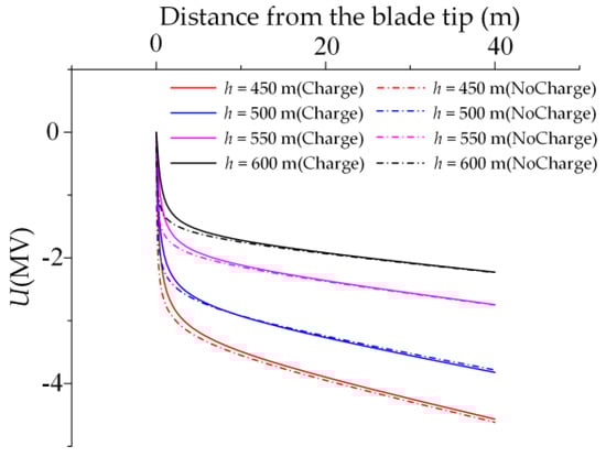The space potential distribution near the upright blade is shown in Figure 3, where h is the height of the DL head, m; and U is the background potential in the direction of discharge axis of the blade tip receptor, MV. Under the combined action of the lightning DL and the blade, the electric field is significantly distorted in the space especially within 5 m from the blade tip. The potential of the area within 10 m from the blade is significantly reduced if the movement of charge around the blade is taken into account. This is due to the accumulated positive charge near the blade tip that neutralizes the negative background electric field. There is no significant difference in the potential beyond 10 m since there is little charge in the area far from the blade.