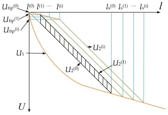 After a UL is generated, DL is assumed to vertically approach the ground incrementally. The corresponding simplified process of UL development is shown in Figure 4 where l is the length of the UL, ls is the length from streamer head to the starting point of the UL, U1 is the background potential and U2 is the distorted potential considering the corona area charge. When the DL develops in the ith step, the potential of the UL head is Utip, which can be calculated as [25]: