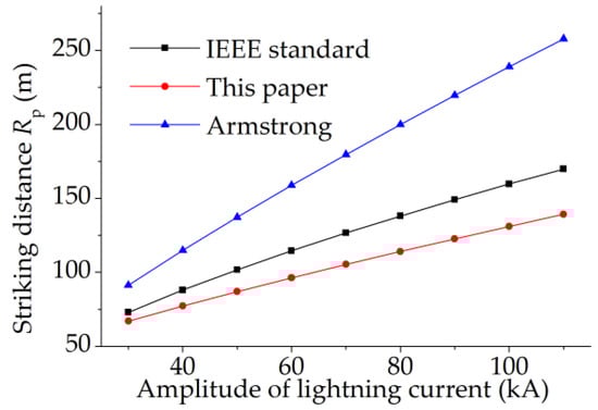 where Ud is the potential of the DL head. The process for calculating Rp is described by the algorithm sketched in Figure 5. The traditional formula of striking distance has been widely used for the lightning protection of buildings with lightning rods. The upright blade is similar to a lightning rod. In this paper, the striking distance of the upright blade was calculated and compared with the result obtained with the traditional formulas (Figure 6). The values obtained with this study are smaller than those of Armstrong and Whitehead [14] as well as the results given by IEEE [26], and are closer to the results of the formula recommended by IEEE. The calculation method used in this paper takes into account the effect of space charge that attenuates the electric field intensity around the blade tip receptor and making the generation of an UL more difficult, which leads to the decrease of Rp. In addition, this method is more consistent with the physical development of lightning and considers the special structure of the wind turbine, unlike the traditional formula which makes it unsuitable for wind turbine lightning protection.