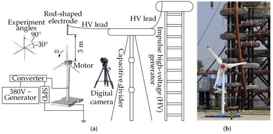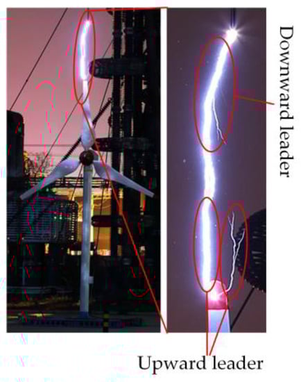 The experimental schematic diagram and the wind turbine model are illustrated in Figure 10, where the height of the scaled wind turbine model is 4 m and the length of blade is 1.8 m. A tip receptor was installed on each blade and grounded by a down conductor. A rod-shaped electrode was used to simulate the lightning DL. The height between the electrode and the wind turbine nacelle was adjusted to ensure that an UL is formed when breakdown occurs (Figure 11). Considering the maximum voltage generated by the impulse voltage generator, the vertical distance between the lower end of electrode and the nacelle was determined to be 3 m.