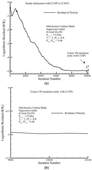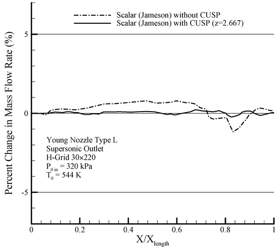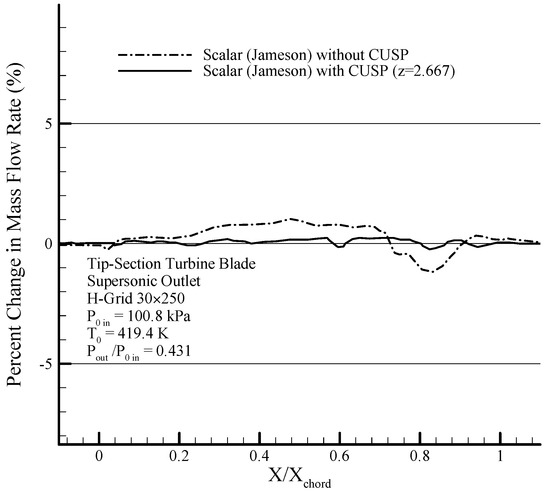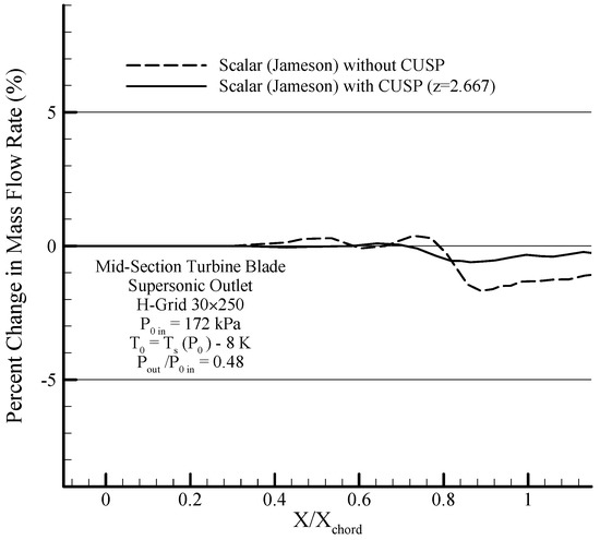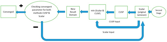 In the present research, in order to reduce numerical errors and thereby improve the results, application of an improved CUSP scheme in Jameson’s two-dimensional finite volume method has been investigated, which is in continuation of previous research and publications of the authors [6,16,17]. The first novelty of this research is the innovative combined use with CUSP and scalar methods (hereforth referred to as the hybrid method) to update the properties at each calculation point. In other words, each property (, , and ) at each calculation point can be calculated by either a CUSP or scalar method, depending on the least deviation (between two latest iterations) as a criterion, but when it comes to the whole set of the aforementioned properties at each calculation point, both of these methods may be used. This is why this innovative method is called the hybrid method.