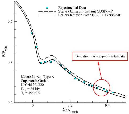 Comparing the distribution of static pressure with inlet stagnation pressure on the center line stream (MP) along the nozzle results of the scalar and hybrid (scalar + CUSP + inverse) numerical methods and comparing with experimental data in supersonic outlet flow for Moore nozzle type A [40].