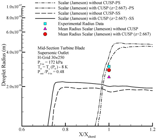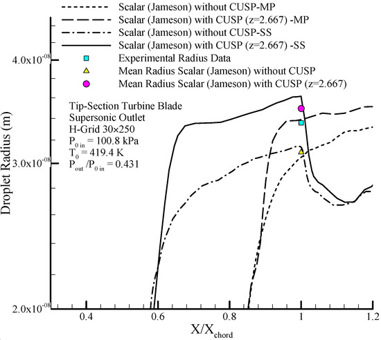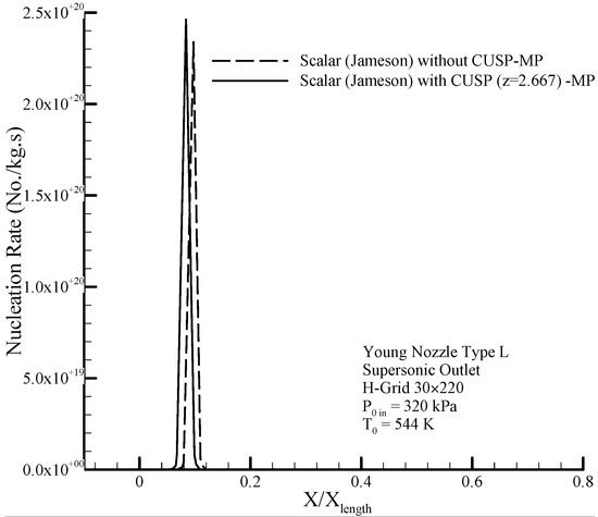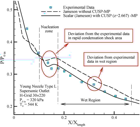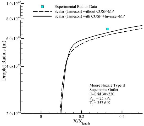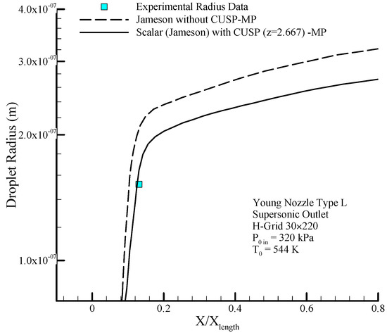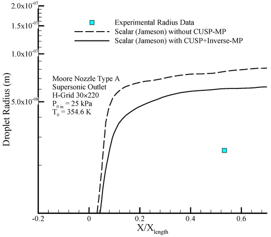 Figure 4 shows the geometry of the Moore nozzle type A [40], where the results of modeling performed by the scalar (original Jameson) finite volume method and the hybrid (scalar + CUSP + Inverse) method are compared with experimental data. In Figure 5 a drop of the pressure ratio is observed where, due to the condensation shock, the pressure ratio first increases until just after the nozzle’s throat, and then starts dropping because of nucleation ceasing and supersonic flow conditions. Figure 6 illustrates the logarithmic changes in droplet radius along the central axis of the nozzle. As shown in this figure, the changes of droplet radius at the beginning, where the supercooled degree is high, is rapid with a steep slope, but after the nucleation region has a slow growth and the flow relatively reaches equilibrium state. It should be noted that the difference between the radius calculated from theory is also reported in the results of other studies [2,41]. As mentioned, at this stage the aim of using inverse modeling is to obtain an optimum value for the parameter which will be calculated in the next section.