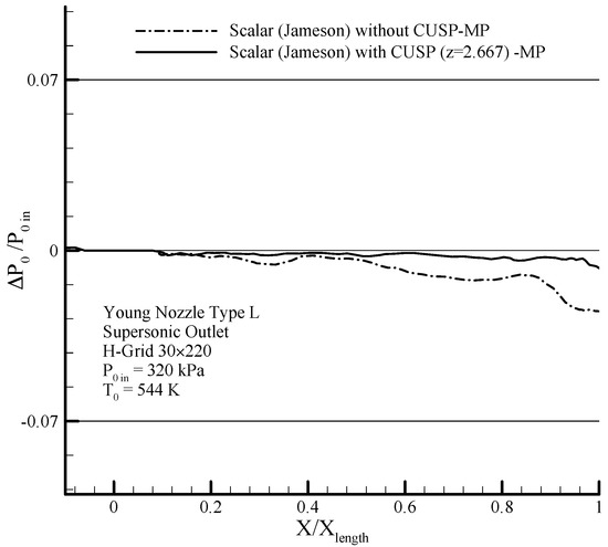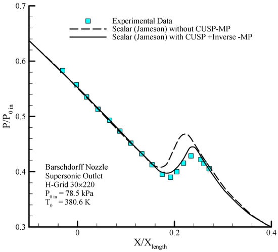 Comparing the distribution of static pressure with inlet stagnation pressure on the center line stream (MP) along the nozzles results of the scalar and hybrid (scalar + CUSP + inverse) numerical methods and comparing with experimental data in supersonic outlet flow for Moore nozzle type B [40].