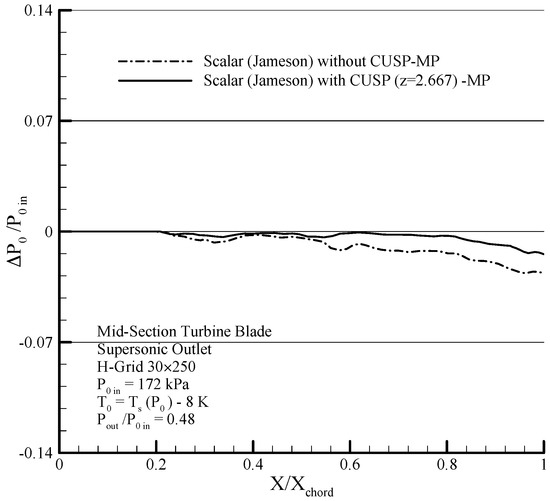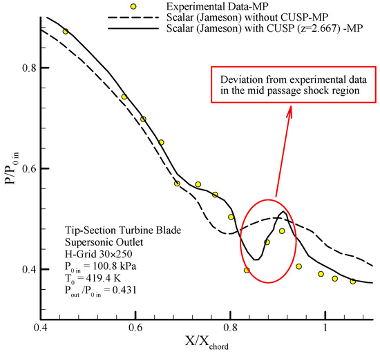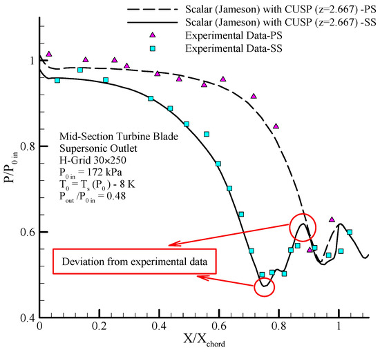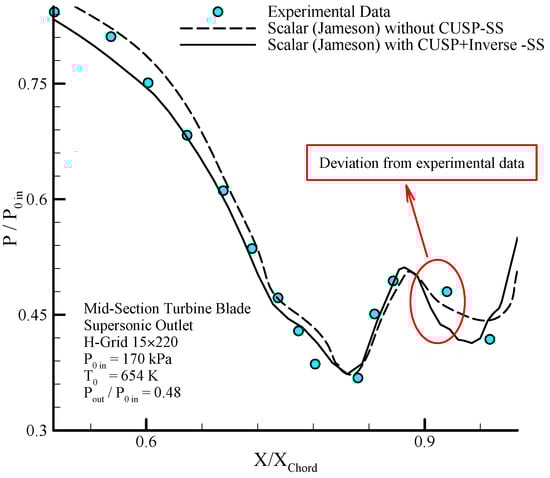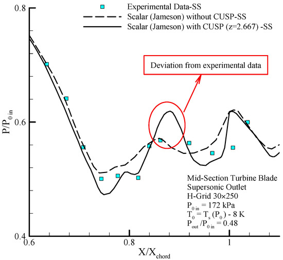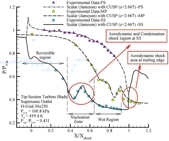 Comparing the distribution of static pressure with inlet stagnation pressure along the blades on suction side (SS) results of the scalar and hybrid (scalar + CUSP + inverse) numerical methods and comparing with experimental data in supersonic outlet flow for dry steam in mid-section turbine blade [1,12].