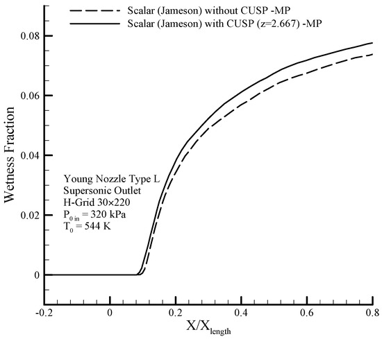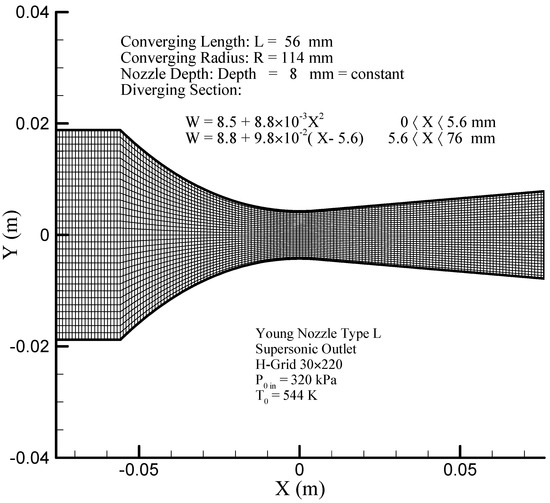 As mentioned before, the aim in this research is to improve two-dimensional modeling of steady state and adiabatic steam nucleating flows in three different geometries (namely Young nozzle type L, mid-section turbine blade, and relatively complicated geometry of tip-section blade of the steam turbine), which is performed using a relatively simple computational grid and the proposed innovative hybrid method (scalar + CUSP, with the desired value of ). Afterwards, a comparison is made between the results of the proposed hybrid modeling in the mentioned cases and experimental data, with an emphasis on shock zones, including the condensation zone. It should be noted that using this innovative hybrid method, one can take advantage of both the central difference scheme and upstream scheme (scalar and CUSP, respectively) at the same time in simulating complex flows in any other finite volume schemes.