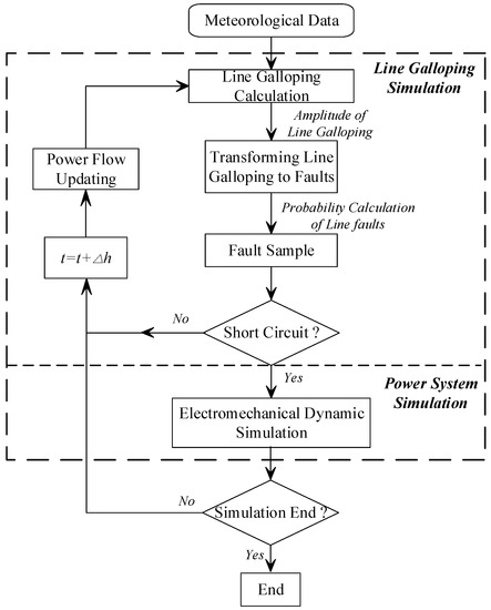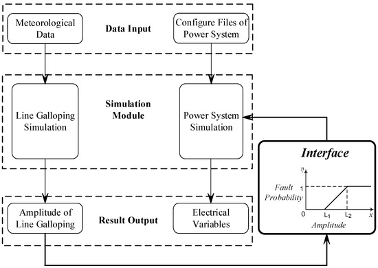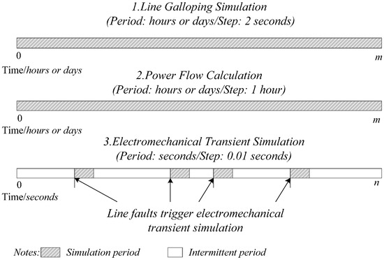 Actually, the simulation of line galloping and power systems should both be conducted throughout the entire simulation period and simultaneously. However, the wind disaster may last for several hours, which will affect the efficiency of the simulation of the power system. Therefore, the two simulation situations need to be coupled into one simulation framework as shown in Figure 4.
