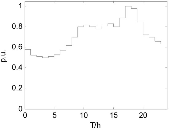 The process of line galloping is of long duration and low precision; however high efficiency and precision is necessary for power system simulation. Hence, line-galloping simulation is conducted throughout the entire period with the step of 2 s. When an electrical fault is triggered, power system dynamic simulation will be conducted for 10 s with the step of 0.01 s. When power system dynamic simulation ends, the result will be saved for power flow calculation. Furthermore, to consider the load fluctuation in the power grid, power flow calculation is conducted throughout the entire period with the step of 1 h. This way, the efficiency and precision of simulation can both be guaranteed. The load fluctuation data adopted in our research is extracted from a typical operation mode, as shown in Figure 5. Different load variation patterns can be adopted with different load data files. Though the results in the paper are based on the specific load variation pattern, it is easy to check the impact of load variation by changing its data file.