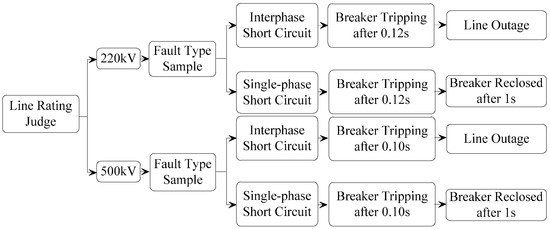 When line galloping results in line faults, interphase or single-phase short circuit may be triggered. The detailed settings are shown in Figure 7, which is based on the “Guide on Security and Stability for Power System”.