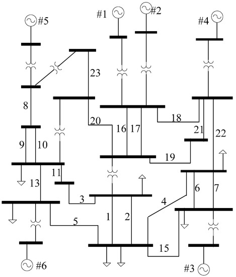 Case studies were conducted using the 23-bus model provided by PSS/E, as shown in Figure 8. In the test system, six machines and 23 nodes are all exposed to strong wind.