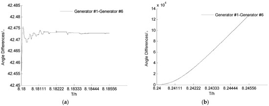 Angle differences between generator #1 and #6. (a) Fault No. 11; (b) Fault No. 12.