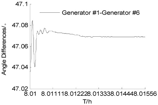 In the fault scenario, when fault No. 1 is triggered, the angle differences between generator #1 and #6 fluctuates out of the short circuit of line #1, as shown in Figure 11.
