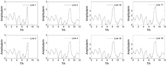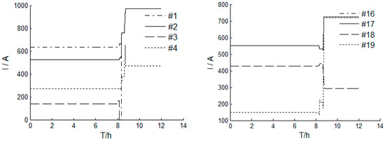 Electrical variables also change with the occurrence of line faults. Take the eight transmission lines listed in Table 1 as an example. When line #3 and #1 are broken at 8:08:24 and 8:21:00, respectively, the line current instantly falls to zero. The current of the other six transmission lines also fluctuate with the influence of single-phase short circuit and line breaking, as shown in Figure 12.