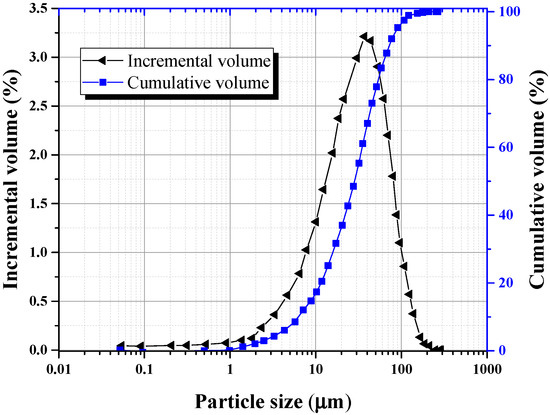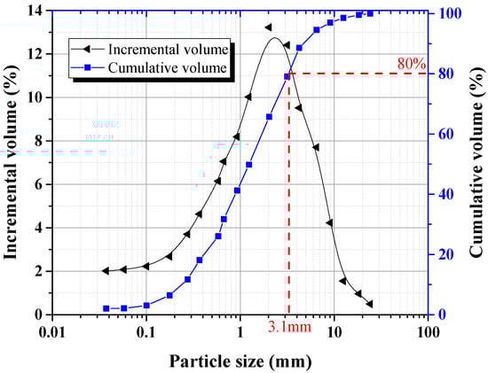 The coal gangue used in this study was obtained from a coal mine waste dump. Typically, the grain size of coal gangue (>50 mm) is too large to use for CPB, which is one significant difference from the tailings grain size (<2 mm) [40]. To meet the standard requirements (slurry segregation, CPB materials transportation and water bleeding, etc.), the maximum particle size should be less than 25 mm and finer particle content should be more than 40% [41,42]. The finer grain contains more water and can be easily transported by the pipeline system. A special designed jaw crusher was used to crush coal gangue. Two stages were needed before the coal gangue particle size reached the demanded size (<25 mm). In the first stage, coal gangue was crushed into sizes between 25 mm and 50 mm. In the second stage, the product of the first stage was processed by the finer crusher. After crushing, the coal gangue was processed by a series of graded sieves to define the particle size distribution, as shown in Figure 1. It can be seen that after the two-stage process, 80% of the coal gangue consisted of small size particles (<3.1 mm), and the sizes greater than 5 mm were only about 5 wt %. From an incremental volume aspect, it was found that most of the particle sizes were between 0.1 mm to 9.0 mm, which can be used for the production of CPB materials.
