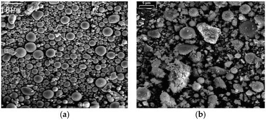 In this study, OPC was used as the binder and fly ash (type C) was used as the additive in the cement. From the above analysis, it was found the average size was larger than tailings. The addition of fly ash, on one hand, can reduce the total average particle size to avoid a blockage of CPB materials in the transport pipeline. On the other hand, fly ash can reduce the binder cost. The fly ash used in this study was collected from a coal burning power plant near the underground coal mine. Laser particle analyzer (DVM5000HD) (Leica, Wetzlar, Germany) and SEM imaging technology were used to study the particle size distribution and the results are plotted in Figure 2 and Figure 3. Compared to the grain size of the coal gangue, the fly ash particle size was almost three orders of magnitude smaller than the coal gangue size. From a previous study described in Reference [17], grain fineness is tightly correlated with pore size and pore distributions, hence the water drainage ability and its strength can be affected by the grain fineness. An appropriate percentage of fly ash and coal gangue are required to optimize the strength of CPB.