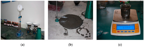 The slump consistency test, water bleeding measurement and segregation test were conducted using each mixture with a different composition content. Segregation is often used in the concrete industry; and the backfill mixture used for mining is a kind of low grade concrete. Segregation is a case of particle segregation and particulate solids tend to segregate by virtue of differences in the size, density, and other properties of the particles. The bleeding ratio is the water bleeding percentage of total mass of cemented coal gangue-fly ash mixture. The biggest factor for this ratio is the water-to-cement ratio as a higher ratio can cause extensive bleeding. The fine aggregates can also affect this ratio. The fewer fines in the mix, the more bleeding will occur. In our test, this ratio was measured by a balance, as shown in Figure 4c. This method has been used by previous researchers [44]. These tests were based on the Chinese standard (GB/T50080-2002). In this study, the desired slump value was 200 mm and the desired bleeding ratio was less than 2 wt %, and according to previous experience, the threshold limit value of segregation was 2 cm. All these values were based on the previous studies in References [43,45,46,47]. All tests were carried out in the State Key Laboratory of Mine Disaster Prevention and Control, Shandong University of Science and Technology, China, as shown in Figure 4.