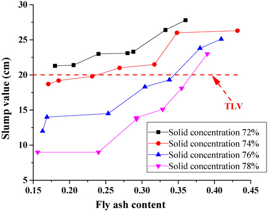 Figure 6 shows the slump property of CPB slurry against fly ash content. From the curves, it was observed that two factors control the slump value: fly ash content, and solid concentration of the CPB slurry. Specifically, the slump value had a positive correlation with the fly ash content increase. For example, with a fly ash content increase from 15% to 45%, the slump value approximately increased from 9 cm to 21 cm (78% solid concentration). Similar trends were observed in other solid concentration conditions. From the solid concentration aspect, the higher the solid concentration, the smaller the slump value. At the same fly ash content level, the slump value (72%) of solid concentration was the largest and a solid concentration value of 78% was the smallest. As shown in Figure 6, the workability of the CPB mixture increased with the increase of fly ash content. This could be associated with the properties of fly ash, which improve the workability of CPB by reducing the water content required for the same degree of workability or slump value due to its rounded shape, as suggested by the SEM analysis (Figure 3). Another finding was that fly ash content had a greater impact on slump value in higher solid concentration CPB slurry. In a 78% solid concentration condition, the slump value increased from 9 cm at 25% fly ash content levels to 21 cm at 37% fly ash content levels, which was an increase of approximately 12 cm. However, its value increased from 21 cm at 17% fly ash content to 26 cm at 37% fly ash content which was an approximate increase of 5 cm. The threshold limit value (TLV) of slump for field use is 20 cm and if this value is below TLV, the fly ash content is inappropriate for field use. From Figure 6, it was easily found that when solid concentration was 72%, all fly ash content conditions were satisfied. When fly ash content was below 25% in 74% solid concentration conditions, the slump values failed to meet the required value. For solid concentrations of 76% and 78%, a high fly ash content was required (35% and 37%).