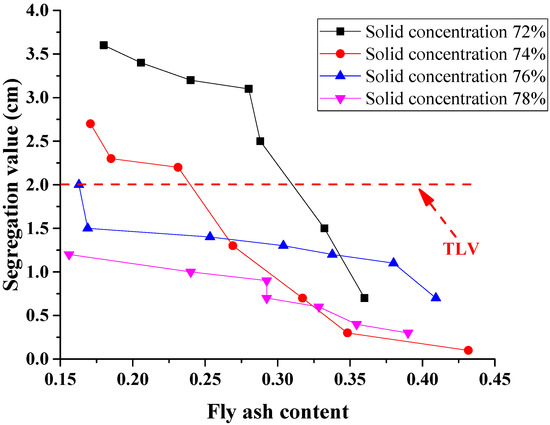 Figure 7 shows the segregation value with respect to fly ash content. From this, segregation had a negative correlation with increasing fly ash content. The maximum segregation as at 17% fly ash content and the minimum segregation occurred at 43% fly ash. Furthermore, solid concentration affects segregation. The higher the solid concentration, the smaller the value. Therefore, fly ash content has a larger impact in low solid concentration conditions, for example, at a 72% solid concentration level, segregation varied from 3.6 cm to 0.5 cm when fly ash content increased from 17% to 36%, which was approximately a decrease of 3.1 cm. For the 78% solid concentration level condition, this value decreased from 1.2 cm to 0.3 cm when fly ash content increased from 15% to 38%, which was approximately a decrease of 0.9 cm. From Figure 7, it was observed that most of the conditions met the requirements except for when the fly ash content was below 25% and 35% in 74% and 72% solid concentration levels, respectively.