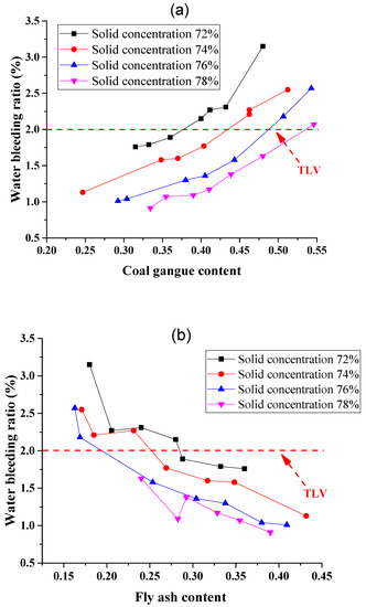 - Fly ash had a significant impact on the slump and segregation properties of CPB. As the fly ash content increased, the slump of the mixture increased and segregation decreased. Coal gangue content also affected the water bleeding ratio, which was due to the large size particle percentage. The higher content of coal gangue could produce a higher water bleeding ratio slurry. Solid concentration (water content) was a key parameter that affected both the hydraulic and mechanical properties of the CPB samples.