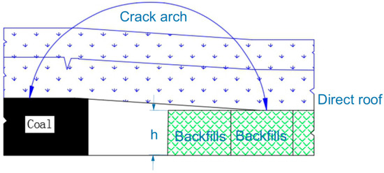 In conventional longwall mining process, three types of district exist in the goaf, depending on the distance to the working face: the caving zone, fissure zone, and subsidence zone. However, in the backfilling process, only a small area of the fissure zone exists. Due to the high ratio of backfill in the goaf (>95%), the deformation of the contact area was in a bending state and there was no caving zone in the goaf. As the roof management is quite different between conventional longwall mining and backfill mining, the terms of direct roof and upper roof based on the position were used here. The strata of direct contact backfills that have a significant impact on the backfills were defined as the direct roof where caving zones exist. The strata that could apply gravity force to the backfills were defined as the upper roof. The strata movement is illustrated in Figure 17. When the working face advanced a certain distance (in this trial 4 m), the backfilling process started. In this step, the direct and upper roof was stable and the displacement minor. The backfills did not afford the gravity force of the roof, as shown in Figure 17a. With the development of the working face, the displacement became more and more evident and the direct roof started to apply gravity force onto the backfills, and the deformation of upper roof could be neglected. During this stage, the backfills supported the direct roof and as the working face advanced, the supporting strength became larger as shown in Figure 17b. When the area of backfills exceeded a certain level, the upper roof deformation became evident and applied its gravity force onto the direct roof. The total gravity of roof was then applied onto the backfills. Hence, the backfills supporting stress increases during the whole process, as shown in Figure 17c. With the increase in the gravity force applied onto the direct roof, the direct roof was broken, and the caving zone generated. The stress applied onto the backfills reached its maximum value, as shown in Figure 17d. From the monitoring results in the trial, the stress in the backfill increased between 220 m and 320 m. Therefore, it was concluded that steps (a), (b), and (c) occurred in this area. With the total gravity applied onto the backfills, the stress and deformation increased gradually. When the direct roof was broken, the total stress became constant. Hence, the stress and deformation in the backfills kept constant. Consequently, in our monitoring results, when the working face exceeded 350 m, the direct roof kept static. The supporting performance was the results of the interaction between the backfills and the roof.