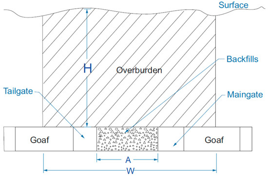 where is the required field stress; is the UCS measured in laboratory; is the width of mining face; and is the height of the backfills. The theory of effective area refers to the backfill area and the weight of the overburden is fully applied on the backfill materials. In the field trial, we used the backfilling mining method to recover the strip mining pillars, as illustrated in Figure 10. Equation (3) was used to calculate the stress applied on the backfills. The weight of the overburden supported by the backfills was calculated as: