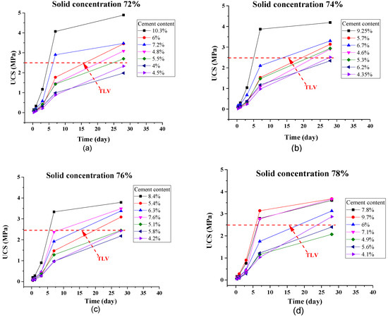 Figure 11 shows the UCS of different CPB samples with respect to curing time. In this study, the mean value of three test results was used to evaluate the strength. From the test results, it was observed that UCS as between 1.5 MPa and 5 MPa for a curing time of 28 days. In different solid concentration conditions, the late strength increased with cement content increase. From the curing time aspect, the UCS strength increased with a curing time increase in the first 30 days of curing time. From Figure 11, it was difficult to distinguish the test results from the early strength aspect (strength after 8 h curing), as all the test results were very close, ranging from 0.05 MPa to 0.35 MPa. Here, which ones above the TLV were recognized from the late strength aspect (strength after 28 days curing), and the results obtained showed that most of the CPB samples could be used except for cement contents of 4% and 4.1%.