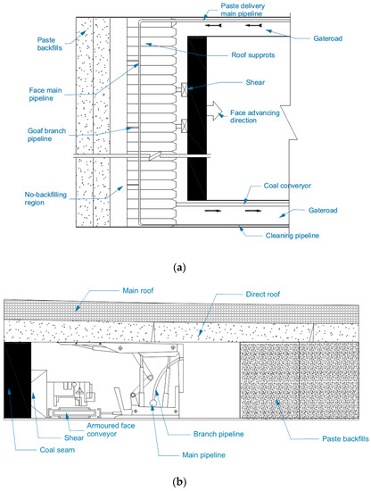 Schematic diagram of longwall mining. (a) Backfilling panel layout plan; (b) Cross section graph.