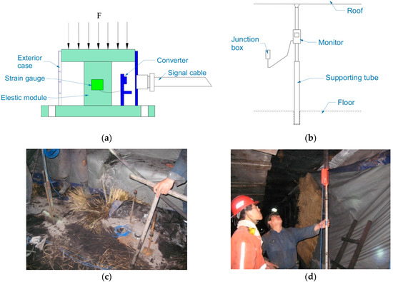 With the recovery of coal seams, strata movement becomes more evident. To test the effectiveness of CPB, stress and displacement monitoring was conducted. In the backfilling stope, the traditional monitoring instruments could not be used due to the severe environment (high temperature, high moisture content and hydration environment, etc.) [50]. In this trial, specially designed stress and displacement meters manufactured by the Institute of Apparatus and Instrument of Shandong University and Science and Technology were used, as shown in Figure 13. The monitoring sensors were installed in the goaf before backfilling and both displacement and stress meters were water-proof. The top side of the displacement meter was installed into the roof and the bottom was connected into the floor. With the occurrence of roof displacement, the value of displacement was recorded by the displacement meter. The stress meter was installed on the floor and was directly connected to the CPB materials. The force applied on the stress meter was recorded and as the working face advanced, the force variation was recorded.