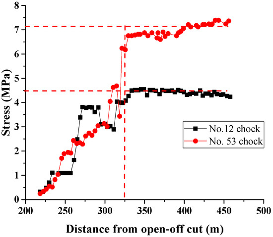 Similar trends of displacement and stress were observed from different sensors. Here, we analyze the results of the third monitoring line. Figure 15 shows the stress variation with the working face advancement of the sensor located at No. 12 chock and No. 53 chock (locations can be found in Figure 14). It was seen that as the working face advanced, the stress increased in the first 100 m, reaching the maximum value before becoming constant. Specifically, the maximum value of No. 12 chock was approximately 4.5 MPa and the maximum stress for No. 53 chock was 7 MPa. Similar trends were observed from both curves, although the maximum stress was different. The maximum stress reached the maximum when the working face was 325 m from the open-off cut.