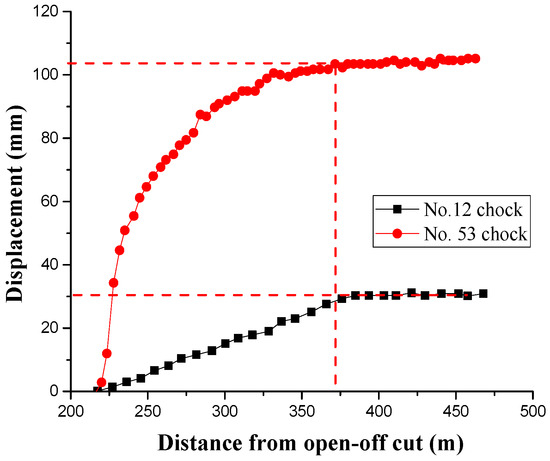 Figure 16 shows the displacement variation with respect to the working face advancement. It was observed that the displacement increased before becoming constant. For the No. 12 chock, a linear increase was observed from 220 m to 370 m. After the working face exceeded 370 m, the displacement at this location was constant at 30 mm. For the No. 53 chock, the displacement increased from 220 m to 370 m, but its increasing trend was not linear. The maximum displacement was about 103 mm which suggested that the CPB could effectively control the roof deformation.