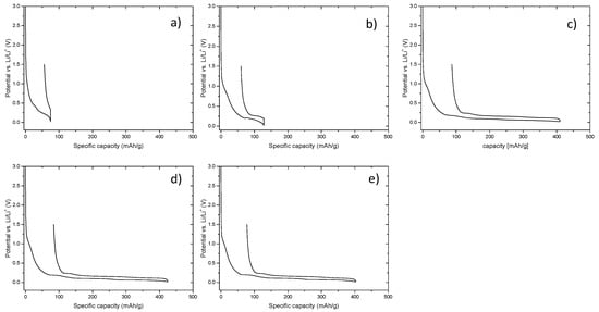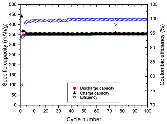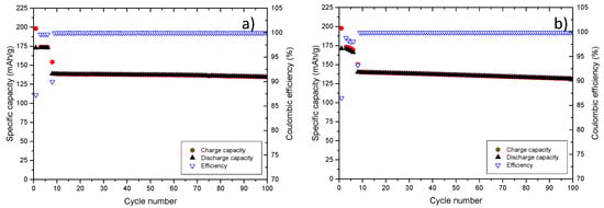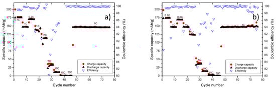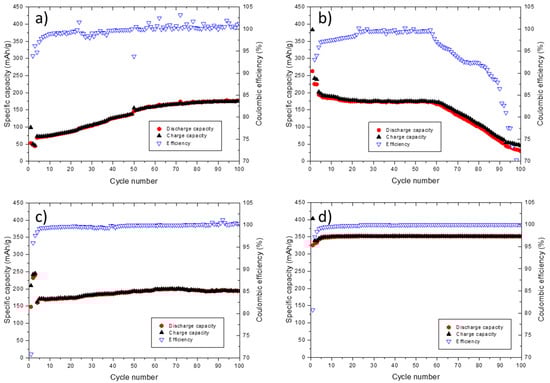Constant current constant potential (CCCP) measurements were performed at 20 °C using a battery cycler (MACCOR Series 4000, Tulsa, OK, USA). The graphite/Li cells were cycled in the potential range between 0.02 V–1.50 V vs. Li/Li+ starting with three formation cycles at charge/discharge rate of 37.2 mA·g−1 (corresponding to C/10, when considering a practical specific capacity of 372 mAh·g−1). After the formation sequence, cells were cycled at charge/discharge rate of 1C (372 mA·g−1). Each intercalation step (1C) was followed by a constant potential step with 1 h duration at a potential of 0.025 V vs. Li/Li+. The cathode capacity-limited NMC/graphite cells (15% oversized anode) were cycled with five formation cycles at 0.1C. After the formation, cells were cycled at 1C over 100 charge/discharge cycles in the voltage range from 3 V to 4.3 V.