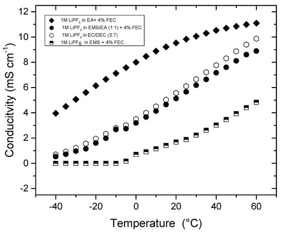 Nevertheless, EMS-based electrolytes are known for much lower ionic conductivity, originating from their high viscosity, compared to the state-of-the-art organic carbonate-based electrolytes. Therefore, ethylene acetate (EA) as low viscosity co-solvent, known for enabling high ionic conductivities in the resultant electrolyte, was added to the 1 M LiPF6 in EMS electrolyte formulation. The obtained conductivity values of selected electrolytes are shown in Figure 3.