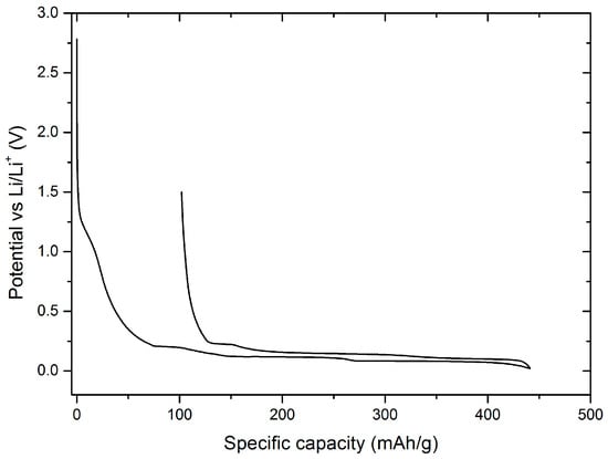 Cycling profile of graphite/Li cell containing 1 M LiPF6 in EMS:EA (1:1) + 4% FEC electrolyte, in the potential range from 0.02 to 1.5 V vs. Li/Li+.