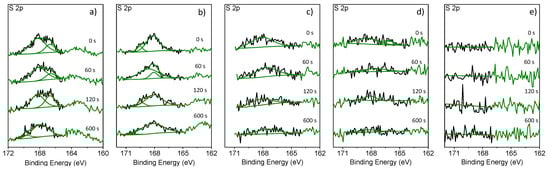 XPS S 2p core spectra of graphite electrodes, after five charge/discharge cycles at 0.1C in graphite/Li cells with different amounts of FEC in the electrolyte (a) 1 M LiPF6 in EMS; (b) 1 M LiPF6 in EMS:EA (1:1); (c) 1 M LiPF6 in EMS:EA (1:1) with 1% FEC and (d) 1 M LiPF6 in EMS:EA (1:1) with 4% FEC; (e) pristine electrode. The electrodes where sputtered for 60 s, 120 s and 600 s, respectively.