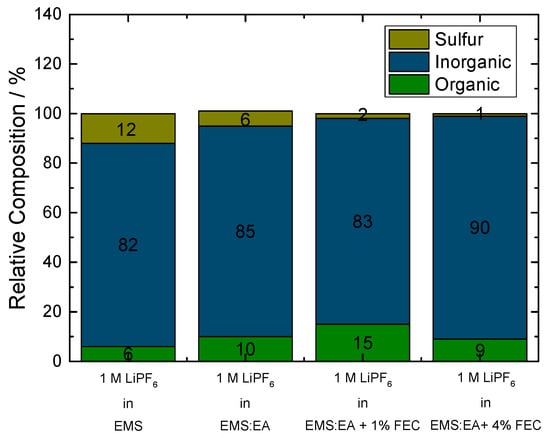 Relative composition of sulfur content, organic and inorganic part of the SEI.