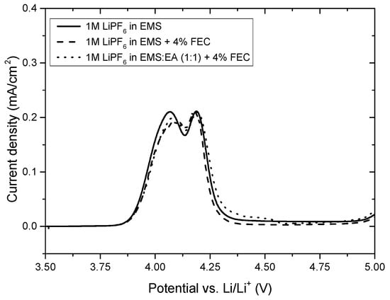 The CCCP measurement of graphite/Li cells indicates a stable cycling performance, excluding capacity fading over 100 charge/discharge cycles. In the formation cycles, a specific discharge capacity of 344 mAh·g−1 is achieved. After the formation cycles, the specific capacity increases to 353 mAh·g−1 in the 5th cycle. This value is comparable to the one received in the CCCP measurement of 1 M LiPF6 in EMS without EA as co-solvent. Over 100 charge/discharge cycles, the Coulombic efficiency values indicate a stable cycling performance. To show the anodic stability of EMS-based electrolytes, linear sweep voltammetry (LSV) measurements on LMO are depicted in Figure 8.