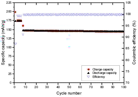With this in line, electrochemical performance in a cell setup, where reactions at the anode and cathode influence each other [,], 1 M LiPF6 in EMS:EA (1:1) with 4% FEC electrolyte, was investigated. Decreasing the amount of EA leads to a lower conductivity of the electrolyte formulation. Increasing the amount of EA would enhance the flammability. The cycling profile of NMC/graphite cell containing the aforementioned electrolyte composition is shown in Figure 9.
