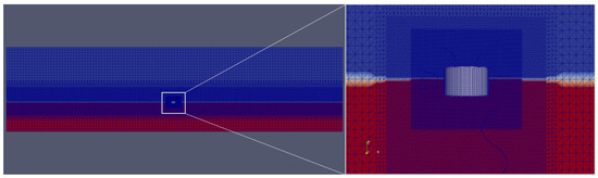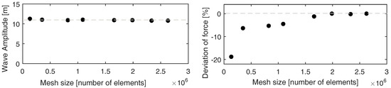 The simulation domain forming the wavetank was 300 m long, 75 m high and had a width of 60 m. The water depth was 26 m to resemble the depth at the Lysekil test site. A mesh resolution study was performed and is presented in Figure 1. The force in the connection line is presented as deviation from the result of the finest mesh, and it is seen to converge with increased mesh resolution. The same mesh was used in [28]. According to this, the domain was discretized using 1,988,000 hexahedral mesh element; the mesh is seen in Figure 2. Each background mesh element had a side length of 2.5 m, which was refined to 0.625 m in a 25 m high box around the water surface. In the vicinity of the buoy, each mesh element was further refined to 0.078 m.
