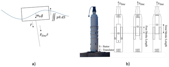 where and are the mass of the buoy and of the translator and is the position vector of the buoy. The restraining forces are the gravity force on the translator , the electromagnetic damping in the generator simplified as , and frictional loss, . The generator damping and friction forces are directed in the opposite direction of the translator movement. As seen in Figure 4b, the translator-stator overlap is not full during the whole stroke length, and the force factor must be multiplied with , where the factor is the fraction of the stator that is overlapped with translator, and c is a factor 2 [27]. When the translator hits the upper endstop spring, a restraining endstop spring force is added; , where is the length of r at still water and the translator stands in the middle position. is the free stroke length, seen in Figure 4b. If the endstop spring gets fully compressed, a second endstop force is added, corresponding to the elasticity of the connection line; , where is the total stroke length, seen in Figure 4b. The Heaviside functions and define when the endstop spring is hit and when it is fully compressed, and depend on the length of the the vector as: