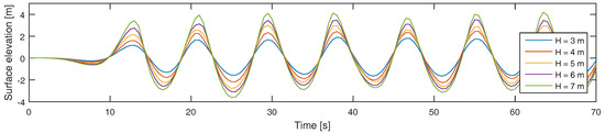 Surface elevation of the modeled incident waves. The wave period was 8.5 s, and five different wave heights were simulated.