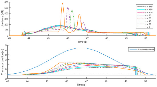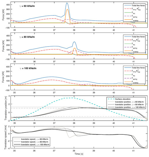 As seen from Section 3.1, the damping of the generator has a large effect on the behavior of the device. To study this in more detail, we looked at the line forces in the time domain, and compared speed dependent generator damping with frictional damping. When all the periodic waves are studied, peak three to seven for all regular waves, it is seen that the endstop forces decrease with increased damping, both speed dependent generator dampings, , as in Section 3.1, and for constant frictional dampings, , as in Section 3.2. In Figure 12, the line force is shown in the time domain for one wave peak from the study in Section 3.1, comparing the impact of different levels of . The incident wave height was 5.7 m, and is the fifth wave peak of the second highest incident wave in Figure 5. It is confirmed that if the endstop was hit, seen as a sharp peak, then an increased damping factor resulted in a decreased peak force. However, once the damping was high enough to prevent the translator from hitting the endstop, further increased damping did not reduce the line force further, but instead increased it. For this specific wave peak, endstop hits were prevented for kNs/m or higher.
