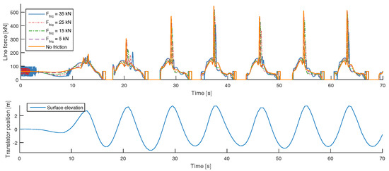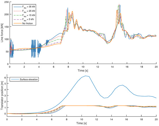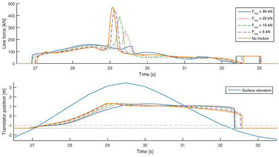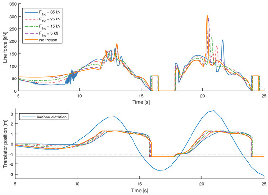 Although it was seen in the physical experiments in [24] that peak forces were reduced by a high friction, it is possible that a low friction could have a latching effect, which would influence the force in the connection line. To study the impact of friction on survivability in extreme waves, both a high regular wave and a tsunami wave were modeled. Five levels of friction were studied for each wave. A friction of kN was the experimental friction measured in [26] and is considered low, and it was also the friction used in Section 3.1. The theoretical case of no friction was included for comparison. Higher friction than 35 kN is not considered relevant, since it would significantly increase the wear inside the generator. The generator damping factor was set to kNs/m for all simulated cases in this section, a value that has been used at the Lysekil test site [20].