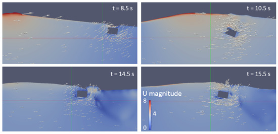 While a deep water wave mainly affects the surface and the fluid velocity decreases with depth, a tsunami wave affects the speed and pressure of the whole water column [31]. The dam-break approach is commonly used to simulate tsunami waves [32,33], and was chosen for the tsunami simulations in this paper. The simulation domain was elongated with 300 m, and an 8 m high water volume was placed on top of the initially still water surface, as seen in Figure 3. The water volume had the same width as the numerical wave tank, and a length of 230 m. The WEC was placed 120 m downstream the initial water volume. The water volume was released as the simulation started, and formed a propagating wave with an amplitude of 6.3 m. The initial conditions were chosen for the tsunami wave to be comparable with a storm induced extreme wave at the Lysekil research site. A relaxation zone of 20 m was placed at the outlet boundary. Since this is too short to eliminate all reflections, the simulations were terminated before reflections occurred.