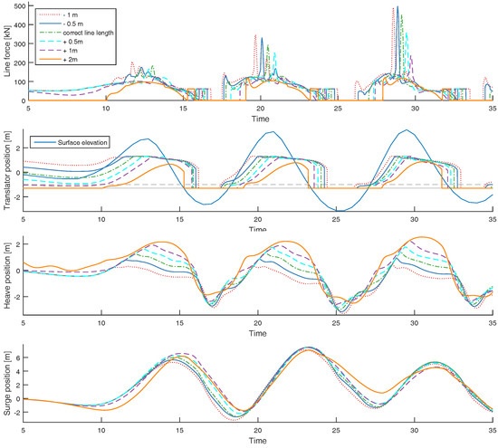 Another possible factor for the survivability is the length of the connection line. An incorrect line length could be a consequence of the changing tide or incorrect calibrations during deployment. A tsunami event could also start with a withdrawal of the waterline and a decreased water level. In this section, the regular wave and the tsunami event were modeled for six different line lengths, comparing the magnitude of the endstop hits and the translator and buoy motion. The water depth was the same for all simulations, and the length of the connection line was altered.