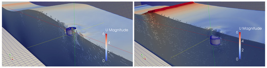 The influence of line length when the WEC was hit by a tsunami wave event was also studied, and is shown in Figure 16. In contrast with the line length study with the regular wave, the magnitude of the peak forces increased with an increased line length. This can again be understood when comparing the different fluid velocity fields of the regular and tsunami waves, shown in Figure 17. Figure 17 shows the WEC with a 2 m to short line, for both the regular wave (left) and the tsunami wave (right), at the time of an endstop hit, t = 19 s for the regular wave and t = 7 s for the tsunami. Although the regular wave had the same wave height as the tsunami amplitude, the velocity fields differed significantly. The surface of the regular wave was smooth, while the tsunami wave had two stages; first a smooth surface elevation, followed by a turbulent bore. If the length of the connection line was correct or too short, the buoy got submerged by the smooth surface rise, and the turbulent bore propagated over the deeply submerged buoy. However, if the line length was too long, the buoy did not get submerged before the bore hit the WEC, and the buoy was hit by the bore and thus impacted by a higher force. The motion in heave followed the same pattern for the tsunami as for the regular wave; an increased line length increased the heave motion, which followed from the restricted translator motion. However, in contrast with the regular wave, the surge motion for the tsunami wave increased for an increased line length, which is explained by the difference between the velocity fields. The velocity of the water in a regular deep water wave follows a circular pattern which results in an oscillating surge motion of the buoy, as seen in Figure 15. The velocity field of a tsunami wave has a horizontal forward speed, and the current drags the buoy forward in the surge direction.