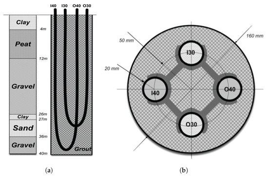Diagram showing: (a) the vertical layout of the borehole, indicating the underground stratigraphy and (b) the top layout with the position and diameter of installed pipes.
