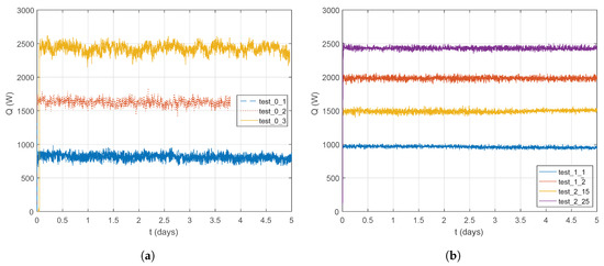 Time plot of heat injection flow rates obtained in the different TRT experiments: (a) using a fixed amount of energy on the heating element and (b) using a PID to control the injected heat flow rate.